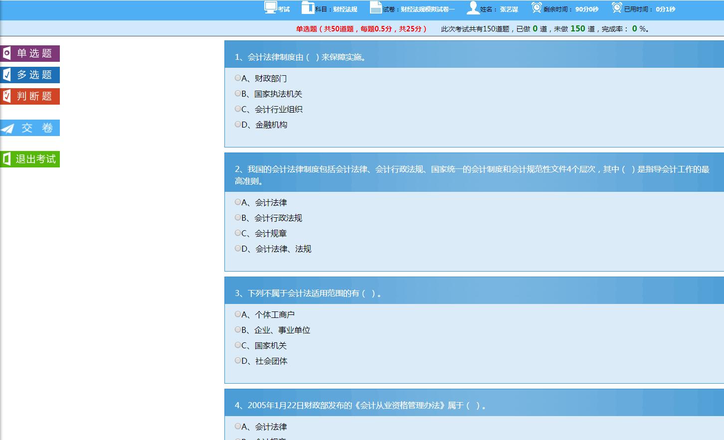 考試界面可以選擇題型模式和單題模式。